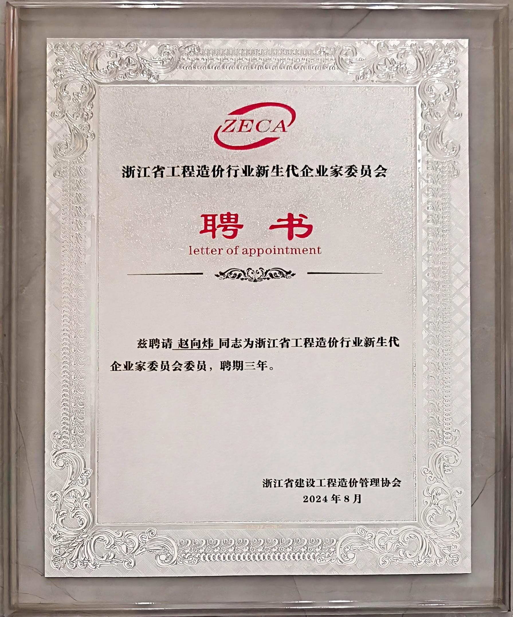 我公司总经理赵向炜被聘为浙江省工程造价行业新生代企业家委员会委员。